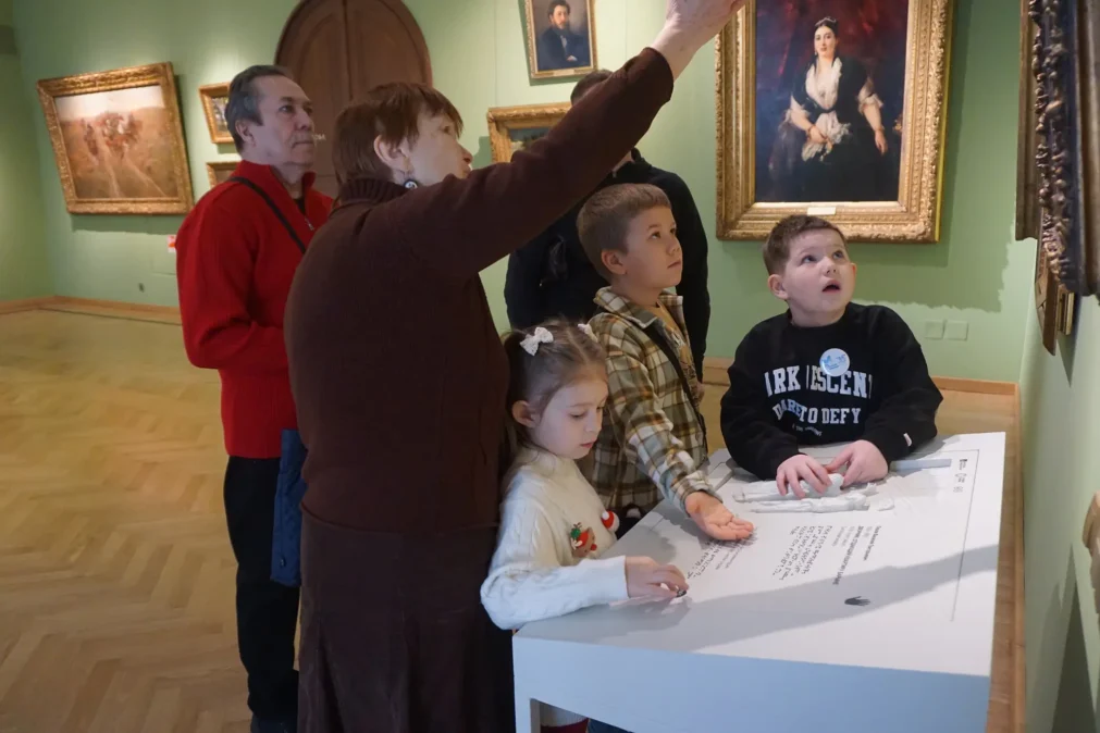 Особое внимание экскурсантов привлекла картина «Портрет А.Е. Ленивова с женой» неизвестного художника и ее тактильная модель. Юные студийцы «Синей птицы» были в восторге от того, что картину можно трогать. Она рельефная, это сделано для людей с особенностями зрения. В ней все продумано до мелочей. Экспонат очень понятный и интересный.