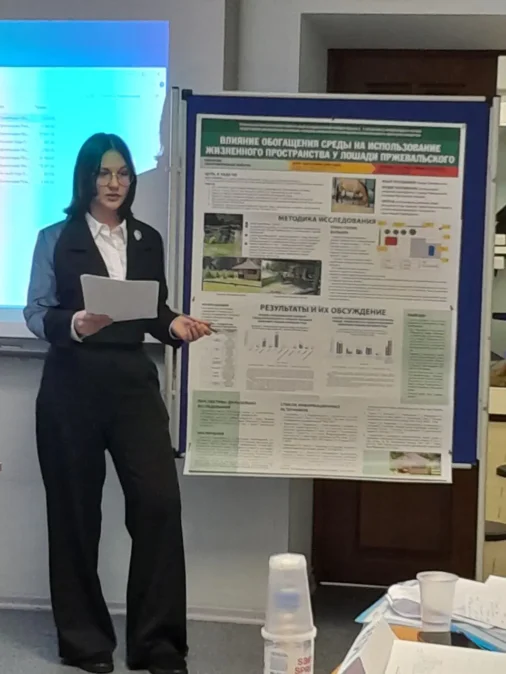 Александра Андрусишина достойно, со знанием дела, представила свою исследовательскую работу в номинации «Экспериментальная зоология» и стала победителем. Работа Александры посвящена изучению влияния обогащения среды на использование жизненного пространства у лошади Пржевальского. Темы работы очень актуальна, поскольку лошадь Пржевальского включена в Красную книгу Российской Федерации с категорией статуса редкости 0 (вероятно исчезнувшие) и создание благоприятных условий для жизни в зоопарке – одна из важных задач.
