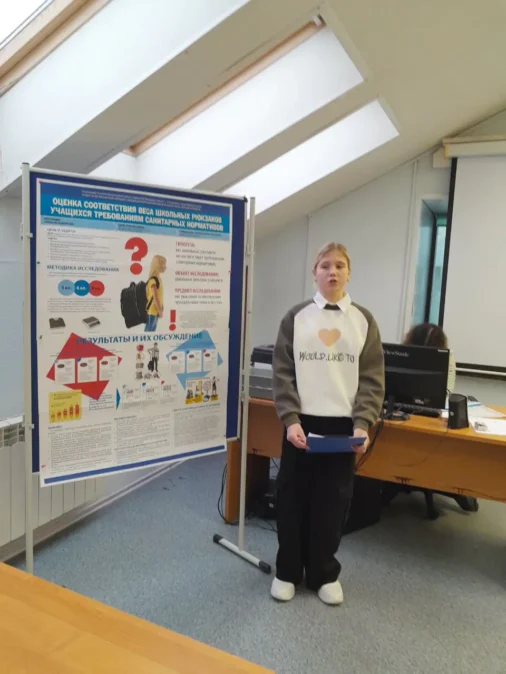 София Лукачева награждена за свой доклад диплом 2 степени. Она представила не менее интересное исследование по очень актуальной теме «Оценка соответствия веса школьных рюкзаков учащихся требованиям санитарных нормативов» в номинации «Юные исследователи».